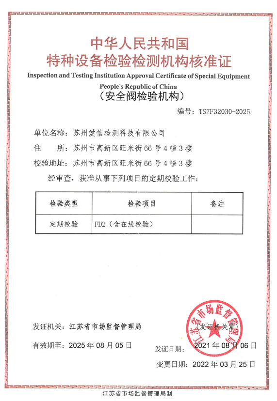 苏州爱信检测科技有限公司位于苏州市虎丘区,业务范围主要包括安全阀的校验、维修、销售;为企业提供仪器计量校准、仪器租赁维修、仪器销售、电子产品3C检测与认证、技术咨询服务等专业第三方一站式技术服务。公司以“遵守法律法规,全心全意的为客户服务”为宗旨,以“公正求实、优质高效、质量为本、信誉为上”为质量方针,不断拓展业务领域和服务范围,不断提高全员素质和各项计量检测能力,加强检测全过程质量控制,保证计量检测工作的公正性、科学性和准确性,更好地为社会服务。